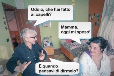 Appunta di qua, fissa di là, nonostante i capelli un po’ troppo corti il parrucchiere riesce, con l’aiuto di moooolta lacca, a dare a Fabiana una parvenza di sposa vera, evento che stupisce molto sua mamma.