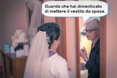 Stratagemma adottato anche da Simone, che per sottrarsi alla confusione adottava la bieca scusa di dover fare le foto “ai preparativi dello sposo”, che non si stava ancora preparando per niente, per fare la spola tra le due case.