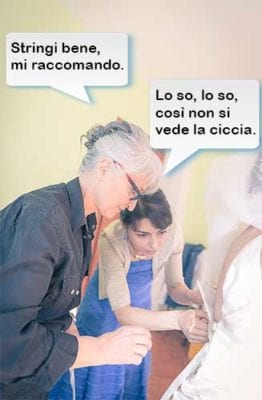 Ovviamente le tipologie di vestizione hanno richiesto accorgimenti ben diversi, da una parte Andrea e Davide badavano più che altro a non sgualcire troppo l’abito, dall’altra c’erano invece discussioni sui massimi sistemi poiché il vestito da sposa era ovviamente un po’ più complicato da far indossare.