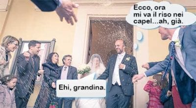 Conclusa la celebrazione e finalmente ufficialmente sposi, Davide e Fabiana sono usciti ricevendo il consueto bombardamento di chicchi di riso, a cui tutti si erano preparati. Tutti tranne uno zio, che si è presentato con in mano direttamente l’intero pacco appena acquistato da un negozio adiacente il Comune. Fortunatamente ha comunque avuto tempo di aprire la confezione…