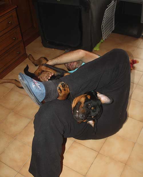 Questo è stato il motivo per cui ho preso un rottweiler anziché un malinois (erano le due razze da lavoro che ancora mi mancavano): vista la mia veneranda età, e visto il fiato che mi ritrovo grazie a quel che mi fumo (inteso nel senso dei tre pacchetti quotidiani di Diana rosse, e non in quello di strane sostanze), ho optato per il cane meno impegnativo dal punto di vista fisico. E infatti Samba si muove proprio poco (non so se si capisce bene dalla foto, ma è in derapata…)