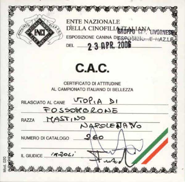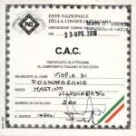 • 5 CAC tutti in classe lavoro di cui almeno 2 acquisiti in esposizioni internazionali. I certificati dovranno essere rilasciati da almeno 4 differenti esperti giudici;