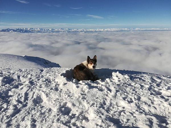 Didascalia: Inverno 2017-2018. Presunto cane anziano con vistoso mantello invernale si riposa a 2.350 m sopra il livello del mare dopo la salita di una vetta.