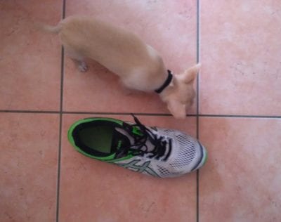Sì, avete visto bene: è un chihuahua… e certo, la scarpa è un 47, ma sempre di microcane si tratta.