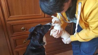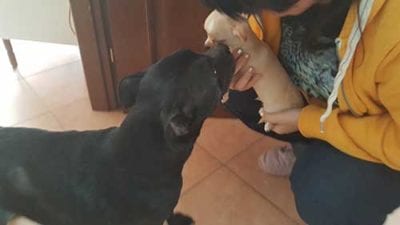 Tutto sommato comunque l’arrivo a casa di Aladino è stato divertente, intanto per il primo incontro con Biba e Destiny (Biba ovviamente non ha ancora ben chiaro che ci sia un nuovo cane in casa, ça va sans dire)…