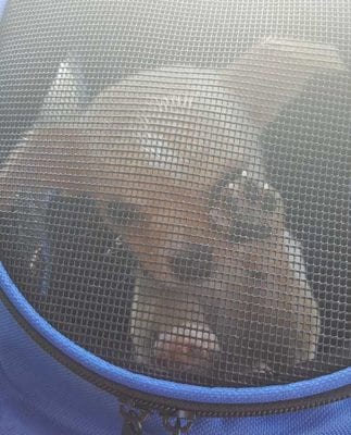 Uè, ciccio, non è stata una scelta da Sciuramaria. L’allevatrice stessa, che allevando appunto Mastini Napoletani (è lei quella menzionata nel “vero standard” della razza in questione) non è certamente una donna tutta fiocchetti e moine, mi ha rivelato di aver capito perché la gente porta questi cani in borsetta. Quando porti un simile cosettino con te a passeggio, se hai una certa fretta perché magari hai anche altre cose da fare è impossibile girare tenendolo al guinzaglio: la gente o ti ferma di continuo al grido di “checcarinoooo!!!”, oppure il Chihuahua non lo vede e lo pesta. Quindi, per evitare la famigerata borsetta, ho scelto la cosa meno imbarazzante, lo zainetto-trasportino. Fermo restando che questo cane la maggior parte delle passeggiate se le farà sulle proprie zampette, perché ho intenzione di farne un cane, non un pupazzetto.