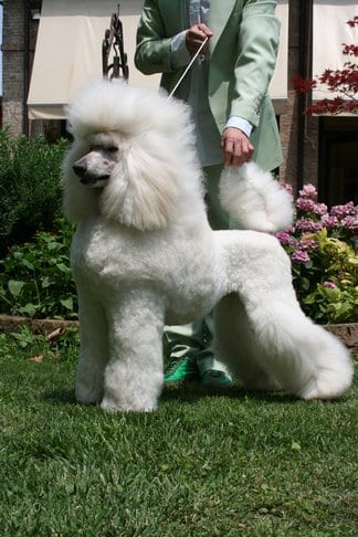 b) sugli arti, i “pantaloni” presentano una distinta transizione con la parte rasata del piede. La lunghezza del pelo aumenta progressivamente verso l’alto per presentare sulla spalla, come sulla coscia, una lunghezza da 4 a 7 cm. misurati su pelo teso, in proporzione con la taglia del cane, ma evitando qualsiasi effetto “sbuffo”. I pantaloni posteriori devono permettere che sia visibile la tipica angolazione del barbone. Qualsiasi variazione fantasiosa che si allontani da queste norme dello standard sarà considerata eliminatoria. Qualunque sia la silhouette ottenuta con la toelettatura, questa non deve mai influenzare il giudizio in esposizione; tutti i cani della stessa classe saranno giudicati e classificati assieme