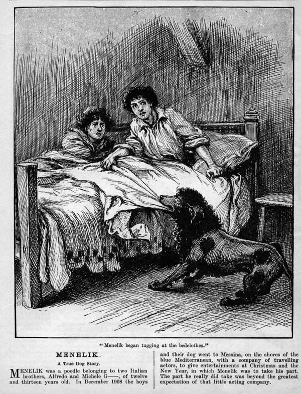 Menelik, un barbone nero, salvò due fratelli, Alfredo e Michele G., dal terremoto di Messina, svegliandoli durante la notte: la storia ebbe ampio risalto nelle cronache dell’epoca, anche fuori dall’Italia.