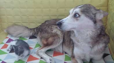 Oltre a uccidere galline, da noi Kiba ha imparato un sacco di cose. Quando è arrivato non sapeva neanche usare il suo cuscinone, così lo scavalcava con aria perplessa. Poi ha visto Yuki svaccata nel suo, e gli si è accesa la lampadina.