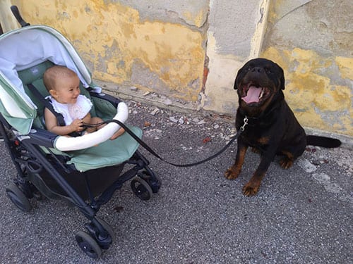 A proposito della piccola bambina impertinente… per quanto ovviamente Giada abbia avuto a che fare con tutti nostri Rottweiler, con Tuono (e con Medusa) c’è stato quel qualcosa in più, probabilmente proprio per quel loro essere zen e quindi non spatafasciarla per terra… anche se Tonino qualche sederata in giardino gliel’ha fatta guadagnare quando in cerca di qualche coccola dimostrava troppo ottimismo sulla capacità di Giada di restare in piedi.