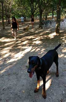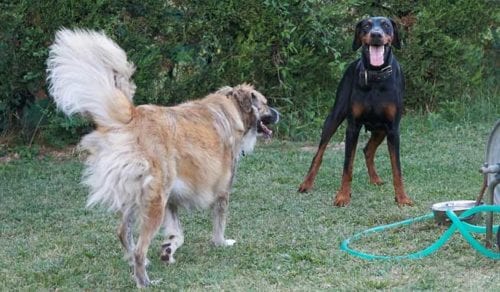 Riusciamo saggiamente a far incontrare i tre cani il giorno prima della partenza, così per farci un’idea dei possibili problemi di relazione (che poi l’unico a preoccuparsi seriamente della cosa ero io, un po’ per “educazione cinofila”, un po’ perché sono entrato ormai nella parte del dobermanista che deve difendere la reputazione del suo cane il quale viene tacciato ingiustamente di pazzia ad ogni bau): Il risultato è incoraggiante: i cani iniziano a relazionarsi pacificamente ed interagiscono senza problemi.