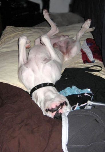 NOTA: se non c’è un divano, una brandina, un letto, insomma qualcosa di morbido su cui spaparanzarsi a pancia all’aria, il Dogo assume una perfetta posa da canemorto.