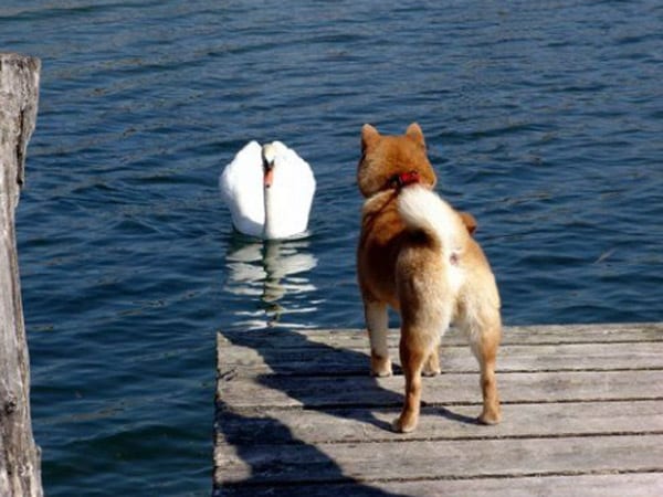 La scena che vedete a destra è un tipico esempio di situazione ad altissima tensione: se lo Shiba è un cane che dà ascolto al suo umano, continuerà ad osservare interessato il cigno e vi permetterà di scattare tante belle foto come questa. Se lo Shiba è uno di quelli che prendono decisioni in proprio, sarà più facile che dobbiate tuffarvi per recuperare il cane prima di dover assistere ad una cruda rappresentazione del più famoso balletto di Fokine (no! “La morte del cigno” NON è di Ciaikosvky e non fa parte del “Lago dei cigni”).