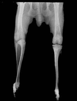 – Terzo grado (o grave displasia del ginocchio): la lussazione è permanente, la tibia è ruotata dai 30 ai 60 gradi e la cresta tibiale è evidentemente deviata, fino ad assumere la forma di una vera e propria virgola; la troclea appare poco profonda od addirittura appiattita e la rotula non è riportabile manualmente in sede nemmeno con l’animale profondamente sedato, a causa del particolare accorciamento del legamento tibio-rotuleo mediale. Molti soggetti riescono ancora ad utilizzare l’arto in posizione semiflessa, anche se l’estensione è resa impossibile dal fatto che la rutula si trova medialmente alla troclea e perciò non riesce ad assolvere il suo compito di fulcro quando il quadricipite si contrae.