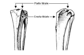 – la parte prossimale (o iniziale) della tibia: si articola solo con il femore, al quale offre due ampie superfici di appoggio, leggermente concave, che complessivamente prendono il nome di piatto tibiale; sulla faccia craniale presenta un’importante protuberanza di forma allungata, detta cresta tibiale, da cui ha origine il legamento rotuleo;