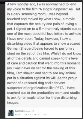 La casa di produzione si è difesa affermando che la scena non è stata girata nel momento in cui il cane ha dimostrato paura dell’acqua e sottlineando che in precedenza avevano provato diverse scene per essere sicuri che l’animale si trovasse a suo agio, e che solo nel momento che è stato ripreso nel video “non voleva saperne di entrare in acqua”.
