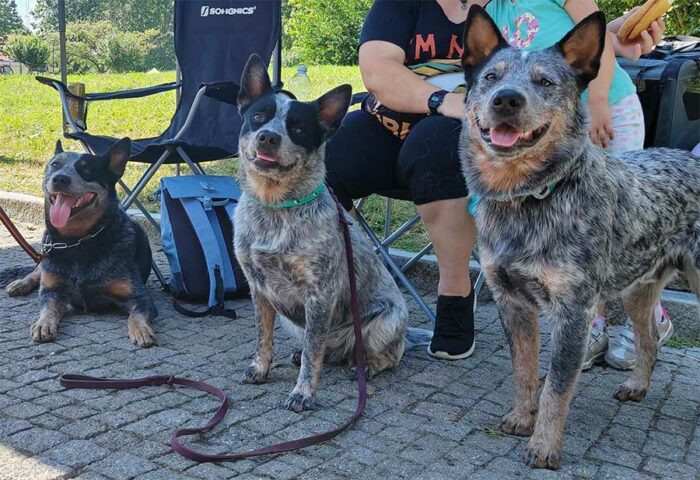 Meno male che durante le lunghe ore di attesa (ovviamente il nostro ring ha millemila cani e impiega il doppio degli altri a portare avanti i giudizi…) incontriamo dal vivo alcune di quelle che fino a quel giorno erano solo conoscenze online, nello specifico Alice Faoro, Caterina Giovannitti e Chiara Canesi accompagnate da una rottweilerina, un labrador e soprattutto due morbidosissimi cattle dog, Harley (femminuccia) e Joy (maschietto), che destano subito l’interesse di Mandriano.