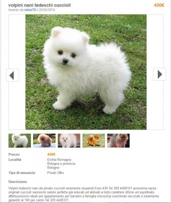 Adesso invece nemmeno quello: nel servizio delle Iene si vede uno degli annunci postati dal commerciante, dove il cane oggetto dell’annuncio veniva venduto per 900 euro: praticamente un prezzo da allevamento serio…quindi non c’è nemmeno più quella scusante!