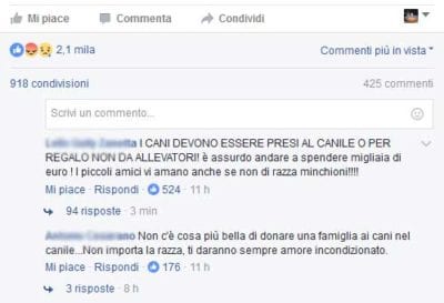 Insomma, del servizio non viene tanto recepito che ci siano i truffatori da cui stare alla larga,ee che la cosa importante da fare sia imparare a distinguere le fonti di acquisto o adozione, ma il consueto “chi vende i cani è un delinquente e chi li compra è un cretino”, con alcune perle del tipo “gli allevamenti andrebbero chiusi e madre natura dovrebbe fare il suo corso”, dimenticandosi che se fosse per Madre Natura probabilmente il cane non esisterebbe proprio, visto che è stato selezionato dall’uomo.