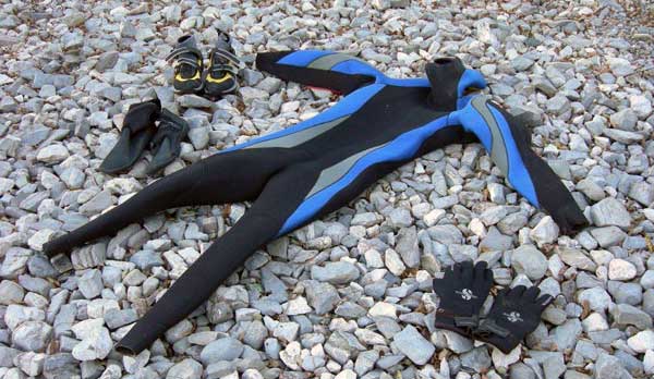 Solitamente è in neoprene e ne esistono di vari spessori. La scelta dello spessore varia a seconda delle condizioni climatiche in cui si opera. Noi, ad esempio, che lavoriamo in un lago molto freddo in inverno, utilizziamo mute lunghe da 5-7mm di spessore, mentre in estate lavoriamo con una 3mm corta.