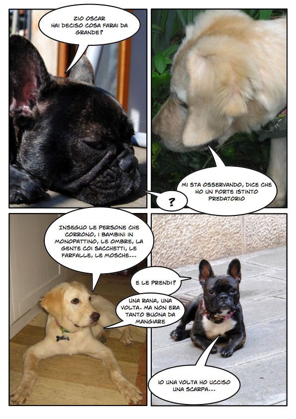 Vorrei spendere due parole sulla “nipotina” di Oscar. La parentela (mi pare evidente) non è per via canina, ma per via umana: la piccola bulldog francese è la cagnolina di mia figlia (sorella umana di Oscar). Quantunque io trovi la sua una delle razze più brutte esistenti, devo dire che è adorabile e facilissima da educare e gestire.