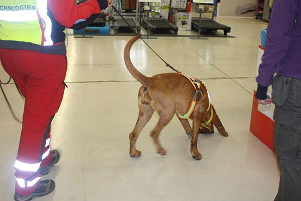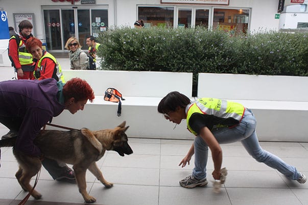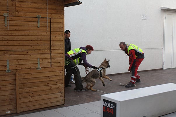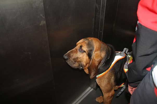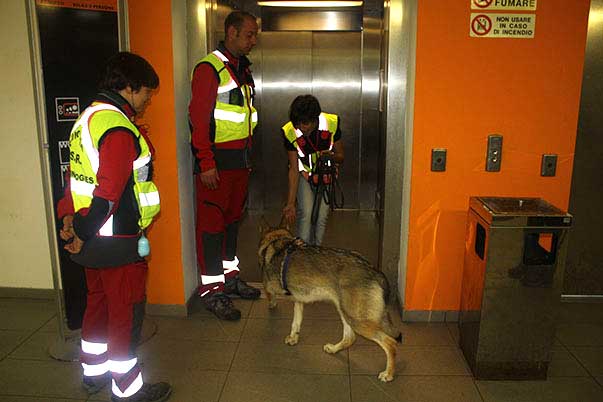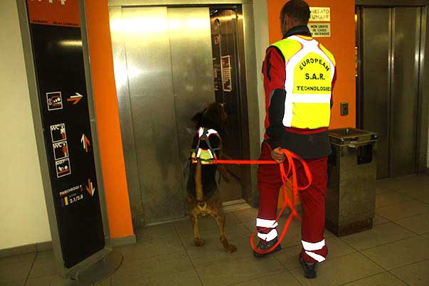 Il cane da mantrailing, infatti, è in grado di: iniziare un lavoro senza utilizzare un input olfattivo (conoscendo la direzione di fuga di un criminale o la posizione dei soccorritori sulla scena del crimine è possibile stabilire la direzione del trail); iniziare un lavoro annusando un cadavere (in questo modo è in grado di seguire l’odore della persona che per ultima ha manipolato il cadavere); identificare il punto di passaggio su di una recinzione, attraverso una porta (in questo allenamento c’era la discriminazione degli ascensori) o l’uso di veicoli ed è in grado di identificare oggetti caduti alla persona durante il percorso, contribuendo così alla raccolta di prove (anche qui abbiamo avuto una dimostrazione pratica, anche se involontaria, come vedremo tra poco); identificare il punto di ingresso in acqua di una persona o di arrivare ad identificare un cadavere al termine di un percorso; stabilire se una persona si trovava effettivamente in un luogo, contribuendo quindi ad identificare eventuali false testimonianze.