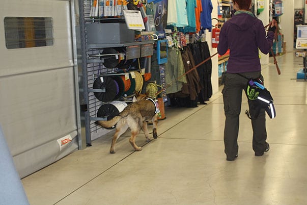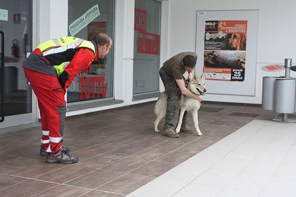 Terminato il percorso che prevedeva, appunto, distrazioni di ogni genere (il centro commerciale era aperto, quindi c’erano persone, bambini, altri cani e così via) e difficoltà logistiche come quella di cui abbiamo appena parlato, il cane seguiva la traccia fino all’ingresso di un negozio (un Decathlon, per l’esattezza, in cui ci hanno gentilissimamente lasciato lavorare con i cani e che quindi ringraziamo di cuore): porta scorrevole – altro momento di difficoltà per i cani non avvezzi ad affrontarle – e poi via, in mezzo ai molti corridoi, perché quel negozio è letteralmente immenso, fino al nascondiglio del figurante.