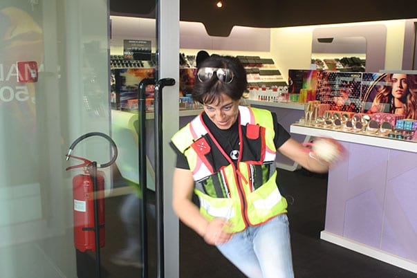 Quella che vedete a sinistra è Grazia Gilardi, schiantata di stanchezza all’uscita del Kiko, un altro negozio gentilissimo che ci ha permesso di lavorare al suo interno con le commesse che applaudivano felici ad ogni ritrovamento: così i cani se la tiravano ancora di più, sentendosi festeggiati da tutti.