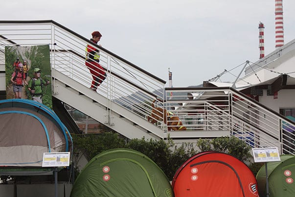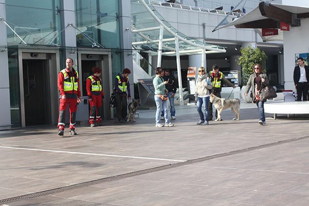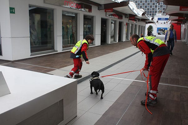 Secondo esercizio: trails in cui il conduttore conosce la posizione del figurante. Nel nostro caso il cane, partendo dal parcheggio del centro commerciale, doveva per prima cosa individuare l’ascensore utilizzato dal figurante (ce n’erano due diversi), poi seguirne il percorso e infine ritrovarlo all’interno del negozio Decathlon.