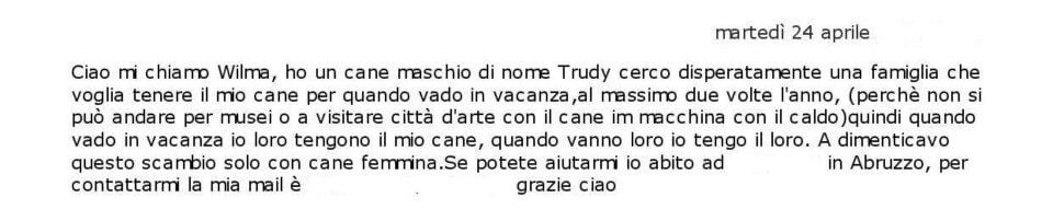 In effetti il primo annuncio è quello meno “drammatico”, anzi potrebbe essere quasi un’idea… però è il modo in cui è redatto che mi lascia molto perplessa: non si dice neppure di che taglia è il cane, che carattere ha, di cosa ha bisogno… questa cerca “disperatamente” qualcuno che glielo levi dalle scatole quando va in ferie e stop. Mi pare un po’ freddino come annuncio, anche se fra tutti è sicuramente quello più accettabile!