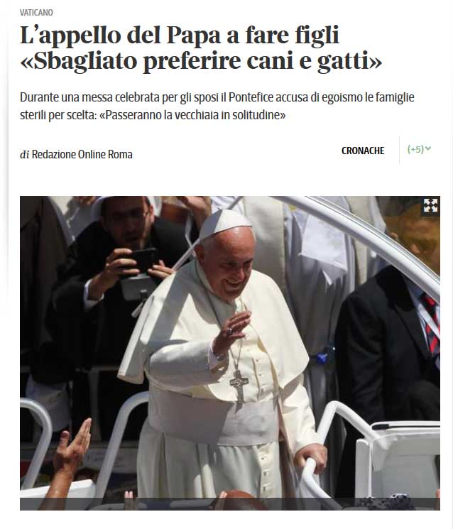 Bene: stando sempre all’articolo stesso, visto che il discorso del Papa non l’ho proprio sentito… il titolo “Sbagliato preferire cani e gatti” mi pare proprio tirato per i capelli.