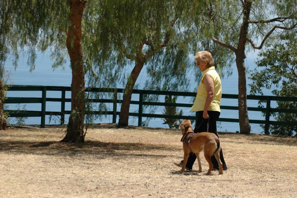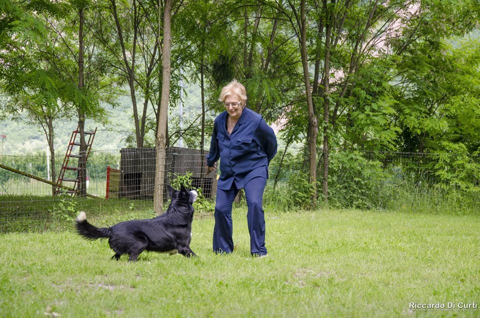 Questo non vuol dire che non cerchi anch’io di utilizzare il corpo: so bene che i cani danno più importanza alla mimica che alle parole. Ma se guardando un cane e Mangini che camminano sembra di vedere due lupi che danzano insieme, guardando me si vede solo un’anziana signora che arranca e cerca invano di tenere il passo: magari cercando di usare i mezzi più semplici, come i segnali di invito o i blocchi corporei… ma aiutandosi parecchio con la voce, perché sa bene che i suoi segnali corporei sono decisamente sfocati e confusi.