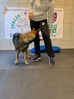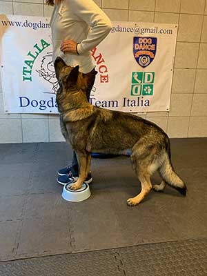 Pivot (1 volta): il binomio deve ruotare sul posto almeno di 180 gradi verso sinistra o verso destra. Il cane può trovarsi in qualsiasi posizione heel o in posizione frontale (vedi foto) rispetto al conduttore. Il pivot è un comportamento in cui il cane ruota verso destra o verso sinistra tenendo le zampe anteriori ferme sullo stesso posto (possiamo immaginare una mattonella 20 x 20 cm all’interno della quale il cane deve mantenere le zampe mentre ruota a mo di vite verso destra o verso sinistra. Per insegnarlo il modo più semplice è utilizzare una ciotola rovesciata, all’inizio si conduce il cane con il bocconcino con le zampe anteriori sopra la ciotola, poi posizionandoci davanti a lui o al suo fianco sempre con l’aiuto del cibo lo facciamo ruotare, verso destra o verso sinistra, premiandolo quando sposta le zampe posteriori.