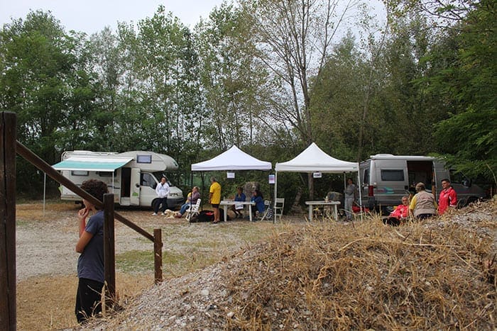 Parcheggi. Terreno per il campo a terra, spazi dove sono stati montati gazebo per la segreteria, la veterinaria e la zona per il pranzo. Anche le attrezzature non mancano ai ragazzi di Renato. Un grande gommone da 40 cv, un gommone più piccolo e tutto il resto.