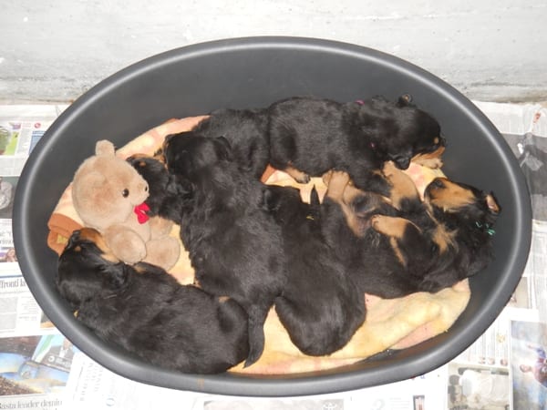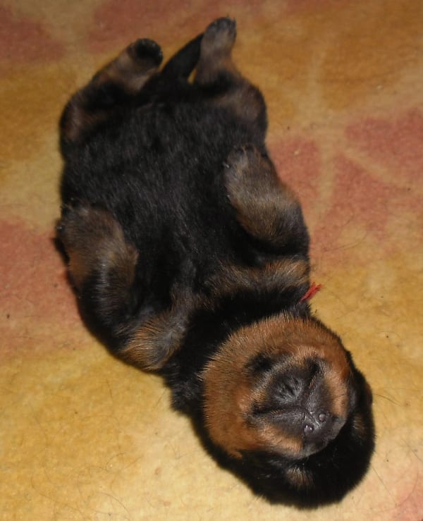 Rebecca inizia a pulirli, curarli ed evitarli con le zampe quando si accuccia vicino a loro. Se qualche estraneo si avvicina, mostra 42 denti affilatissimi (non l’aveva MAI fatto prima, a nessuno). Rimane ore immobile con i piccoli, e riesco persino ad iniziare il programma “senso puppy”, perché i piccoli si rinforzano sempre di più.