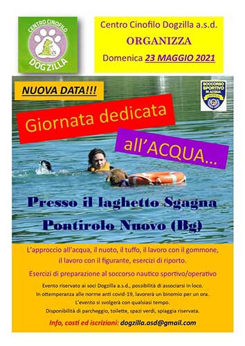Domenica 23 maggio a Pontirolo Nuovo in provincia di Bergamo come Centro Cinofilo Dogzilla A.S.D. siamo riusciti ad organizzare una giornata all’acqua. Tempo da lupi il sabato, molto sole anche se non caldissimo, la domenica.