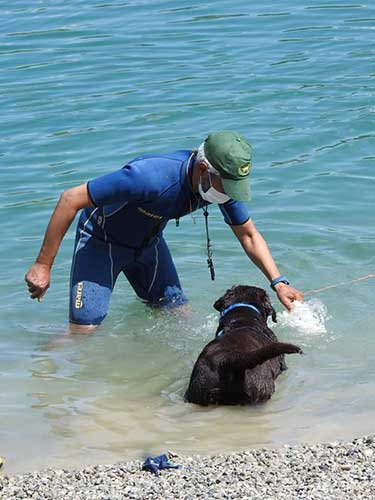 Insieme a me in acqua il mio Tommaso, sempre a suo agio ormai in acqua e con una lettura dei cani che a volte, solo a volte, mi sorprende… sulla spiaggia Roberto Albanese a coadiuvare il lavoro tra acqua e terra e a darci una mano l’amico Fabio Chiapponi.