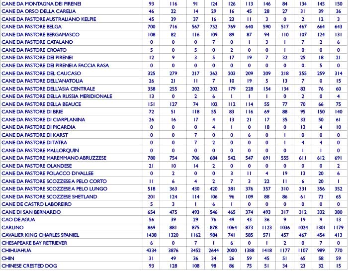 E’ triste vedere come, a parte il jack russell, tutti gli altri terrier stanno avendo un significativo calo e i levrieri come sempre sono pochissimi. Mi sorprendono il volpino italiano e il chow chow, vedendone a fiotte pensavo fossero molto più diffusi, devo quindi ipotizzare che la maggior parte dei cani che vedo non abbiamo pedigree? E si spera che la moda del CLC passi in fretta… cani stupendi ma troppi in mano a persone sbagliate!
