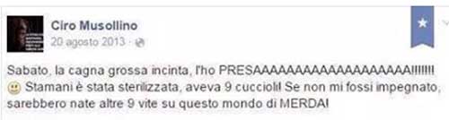Mi sembra che il bimbetto (perchè signor non lo si può chiamare)Ciro abbia qualche problema di schizzofrenia.Va bene ridurre le nascite causa randagismo ma non sbudellare una cagnetta dai cuccioli ormai sviluppati.Poi i commenti screennati sono il top.Particolarmente interessante l’ultima parte dell’articolo anch’io la penso così signora Rossi.Lei dovrebbe sta al Parlamento.