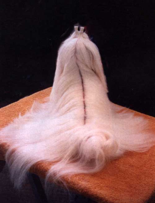 Non esiste sottopelo – sulla testa il pelo è lunghissimo, tanto sulla canna nasale dove si confonde con quello della barba, quanto sul cranio dove discende sino a confondersi con quello delle orecchie. Sulla coda i peli ricadono su di un solo lato del tronco, e cioè su un fianco e sulla coscia ed hanno una lunghezza tale da raggiungere il garretto.