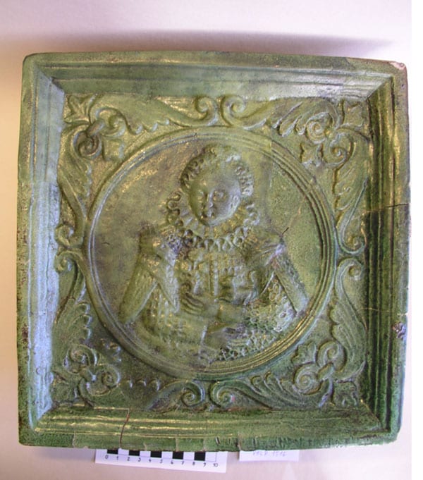 A destra potete vedere la foto di una antica piastrella che è stata trovata durante una ricerca archeologica nel castello di Praga. E’ stata trovata durante una ricerca archeologica del Lobkowitz Palace (n. 3), più precisamente nel riempimento, con le altre simili, che servivano per compensare le disuguaglianze nella parete. E’ datata all’ inizio del 17 secolo, le dimensioni sono: altezza: 315 mm, larghezza: 308 mm, profondità: 78 mm. Smalto verde trasparente. La piastrella è stata incollata e completata.
