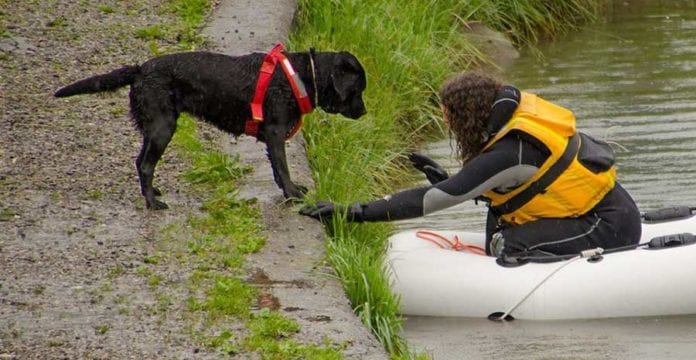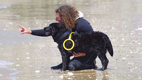 Sul fronte operativo solitamente i cani utilizzano l’imbracatura detta “a tartaruga”: la suddetta avvolge quasi tutto il cane e lo dota di un’altissima galleggiabilità.