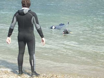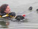 Lo stesso esercizio può essere eseguito con il cane che parte dal gommone. Tuffo, nuotata verso figurante e ritorno.
