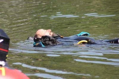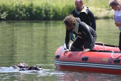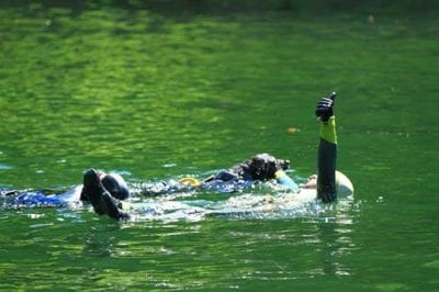 Faccio in modo che il figurante sia o con il giubbetto galleggiante o su un materassino, così da agevolare il lavoro del cane.