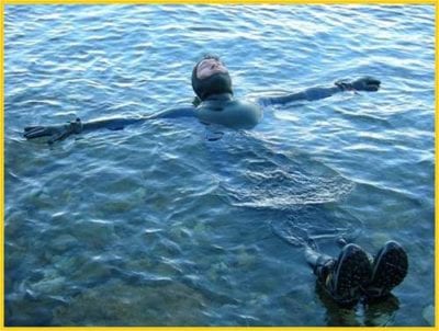 La posizione iniziale che deve assumere è quella a croce o a “T” dando i piedi al cane. Da lì in poi è in balia di onde e correnti (se ve ne fossero) e la posizione che assume non è più controllabile dal figurante stesso. Come si mette, si mette!