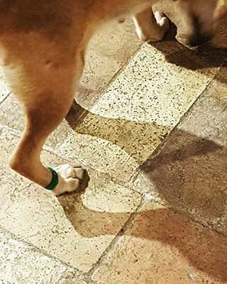 Un semplice elastico per capelli di spugna morbida posto su una gamba del cane, sopra la caviglia, durante le sessioni di lavoro contribuisce ad aumentare la consapevolezza degli arti. Anche pochi momenti di lavoro con bendaggi per gli arti possono aiutare il cane a sentirsi connesso con tutti e quattro i piedi.