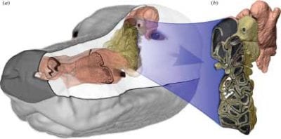 Nel naso è anche presente una piccola struttura chiamata “organo vomero-nasale o di Jacobson”, sede del cosiddetto “paraolfatto”, che gli permette di percepire i ferormoni, messaggeri chimici che trasmettono informazioni tra individui della stessa specie.
