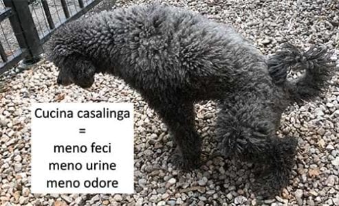 Nel cibo industriale è presente uno zavorrante, solitamente fibre di barbabietole, che ha la funzionalità di aumentare la quantità fisica del pasto, perché il cane ha un concetto di quantità ben chiaro nella sua testa. Lo zavorrante non venendo digerito, viaggia lungo tutto l’intestino facendo un tour gratuito e viene espulso come scarto nelle feci. Il cibo casalingo, costituito come abbiamo visto per la maggior parte da acqua e da preziosi nutrienti, viene digerito quasi totalmente, crea poco scarto, riducendo così sia la necessità delle uscite per espletare i bisogni fisiologici che la quantità degli stessi.