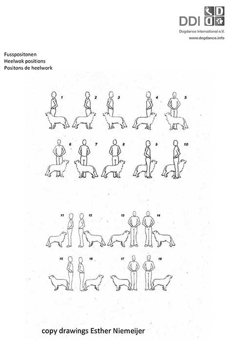 Cercando di analizzare nel dettaglio le 18 posizioni, dalla 1 alla 8 il cane deve assumere una posizione in cui la sua spalla dovrebbe essere tangente la gamba del conduttore, la distanza tra la gamba e la spalla del cane deve essere minima, senza obbligo di contatto e nello svolgimento della routine tale distanza deve essere costante anche cambiando la posizione.