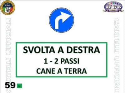 Parliamo infine degli esercizi SVOLTA A DX O SVOLTA A SX 1-2 PASSI CANE A TERRA: il binomio esegue una svolta a sinistra o a destra con un angolo di 90° e dopo 1 o 2 passi a scelta il conduttore si ferma e chiede al cane di andare nella posizione del terra (senza passare dal seduto), quindi direttamente dal terra il binomio riprende la condotta verso il cartello successivo.